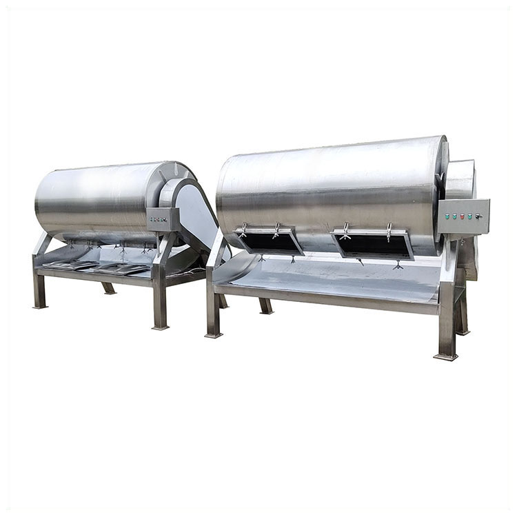 博瑞機械滾揉機槳葉圓弧形,設(shè)計獨特,工藝復(fù)雜,使腌料分布均勻,對產(chǎn)品表層不造成傷害,使產(chǎn)品的柔嫩性和外觀得到提高。本機是在真空狀態(tài)下,利用物理沖擊原理,讓魷魚片或魷魚條、肉餡等在滾筒內(nèi)上下翻動,相互撞擊、摔打,從而達(dá)到按摩、腌漬作用。腌漬液被產(chǎn)品充分地吸收,增強產(chǎn)品的結(jié)合力及彈性,提高產(chǎn)品的口感及斷面效果;可以增強保水性,增加出品率;可以改善產(chǎn)品的內(nèi)部結(jié)構(gòu),通過我們廠家生產(chǎn)的大小型真空滾揉機能使產(chǎn)品體蛋白質(zhì)分解成水溶性蛋白,易被人體吸收,真空腌制機具有肺呼吸功能,讓產(chǎn)品在滾筒內(nèi)膨脹,縮小了往復(fù)運動,改善了產(chǎn)品組織的結(jié)構(gòu),提高了切面效果。電機變速箱、真空泵、電器部件均采用國家知名品牌,以確保整機質(zhì)量。